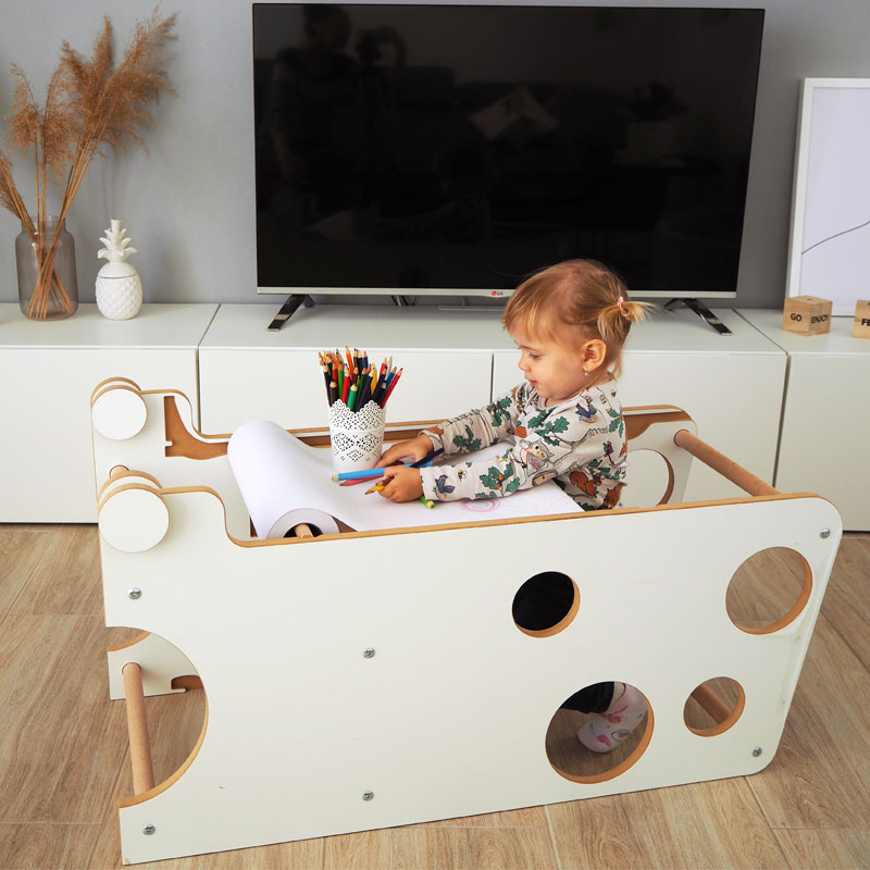 Stoupací schůdek věže lze snadno proměnit v pohodlné sedátko u stolečku nebo ve vysokou židli ke standardnímu jídelnímu stolu.