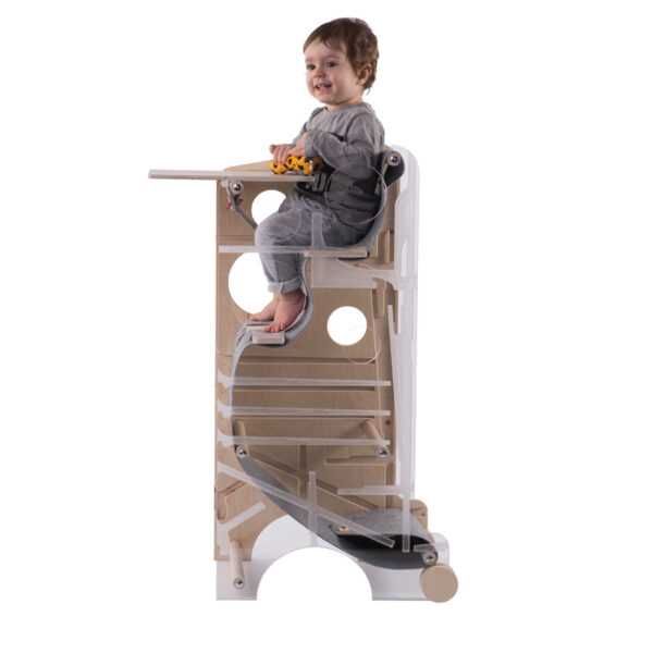 Stoupací schůdek věže lze snadno proměnit v pohodlné sedátko u stolečku nebo ve vysokou židli ke standardnímu jídelnímu stolu.